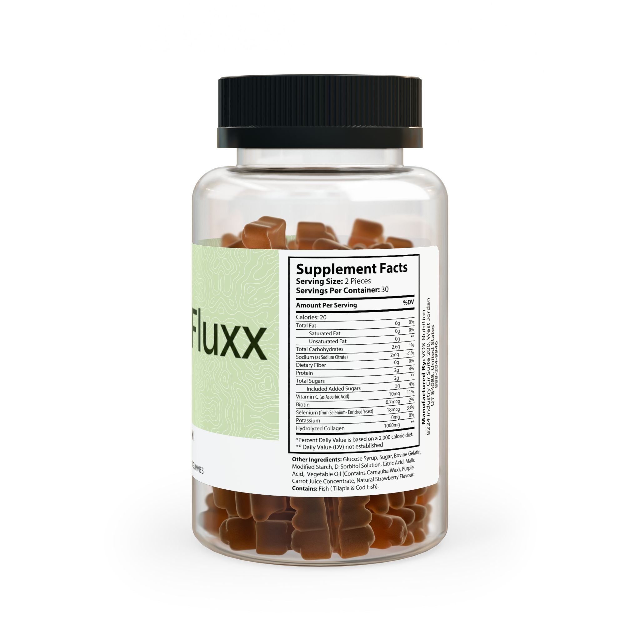Ingredients: Sodium (as Sodium Citrate), Dietary Fiber, Protein, Included Added Sugars, Vitamin C (as Ascorbic Acid), Biotin, Selenium (from Selenium- Enriched Yeast), Potassium, Hydrolyzed Collagen. Other Ingredients: Glucose Syrup, Sugar, Bovine Gelatin, Modied Starch, D-Sorbitol Solution, Citric Acid, Malic Acid, Vegetable Oil (Contains Carnauba Wax), Purple Carrot Juice Concentrate, Natural Strawberry Flavour. Contains: Fish ( Tilapia & Cod Fish)